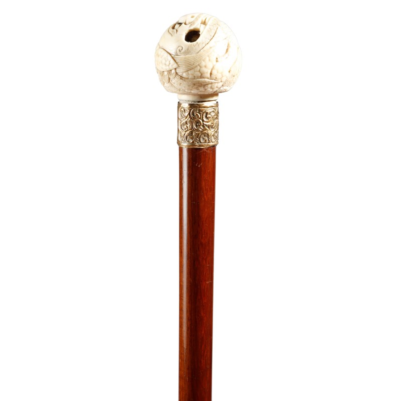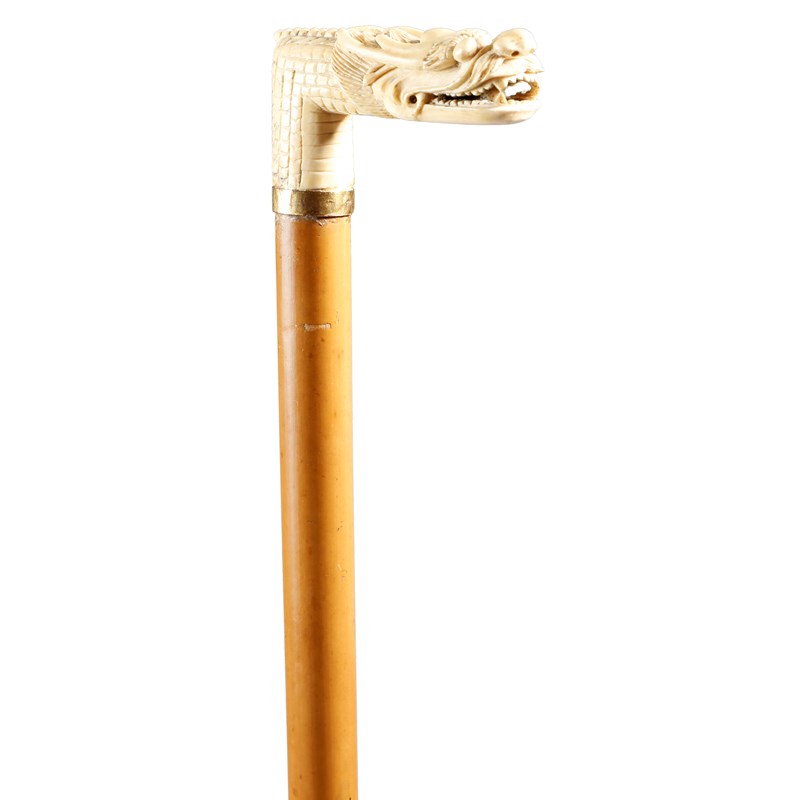 λ Two late 19th century Chinese ivory handled walking canes, carved with dragon's heads, each with a pearl in its mouth, with gilt metal ferrules, one with a Malacca shaft, 96.7cm long (max). (2)