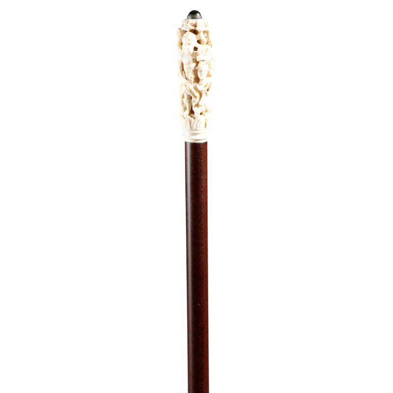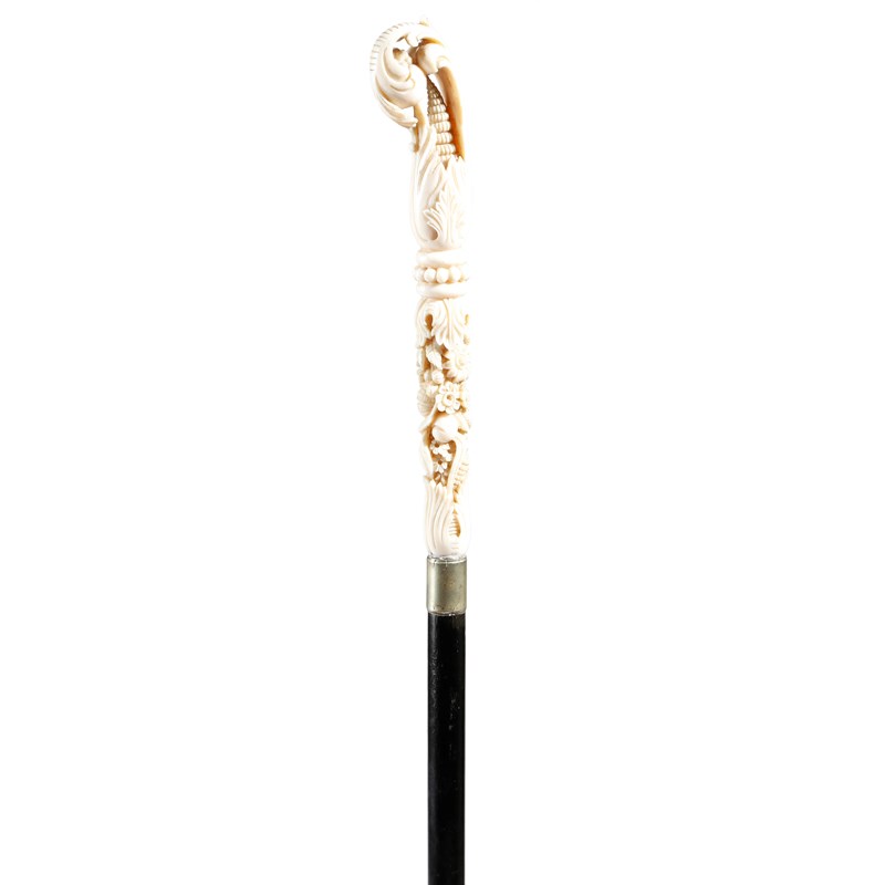 λ A late 19th century walking cane, the ivory handle carved with Judith beheading Holofernes, with a hardwood shaft and a horn terminal, 92.5cm long, together with a late Victorian ivory handled cane, carved with scrolling leaves, flowers and fruit, with an ebonised shaft. (2)