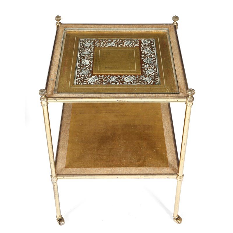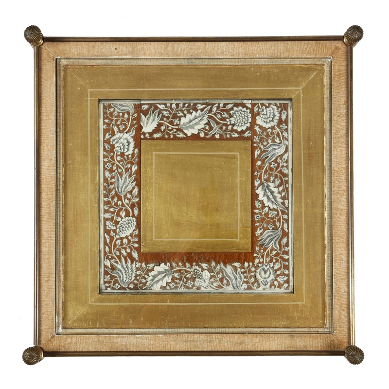 λ A pair of gilt brass occasional tables, probably by Mallett, each with an inset glass top with an 18th century Indian Vizagapatam ivory floral border, on castors, mid-20th century, 59cm high, 43.2cm square. (2)