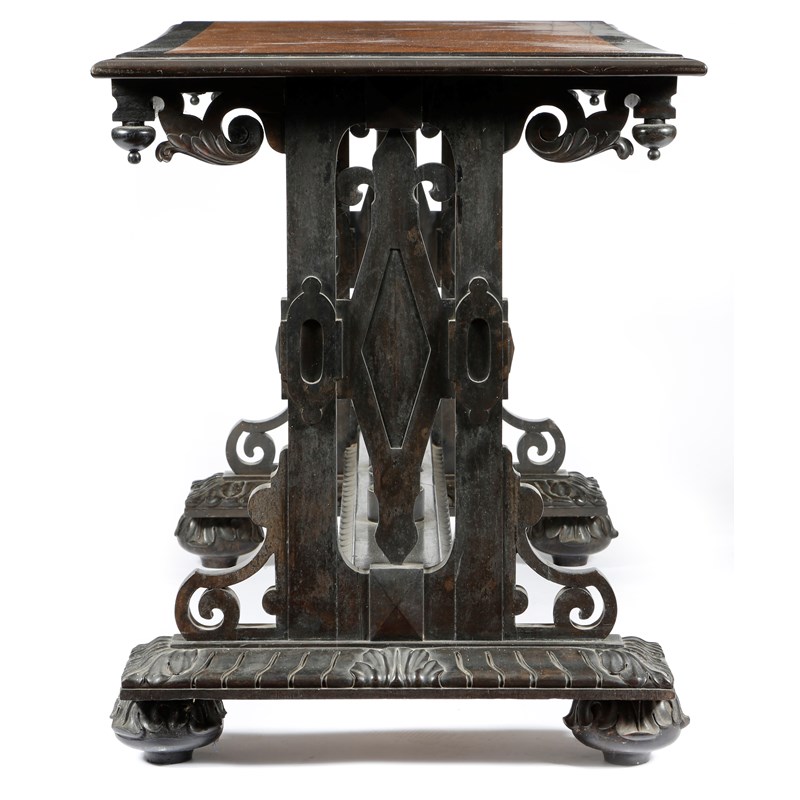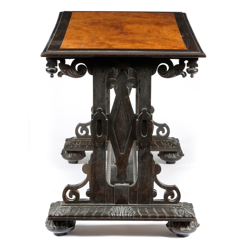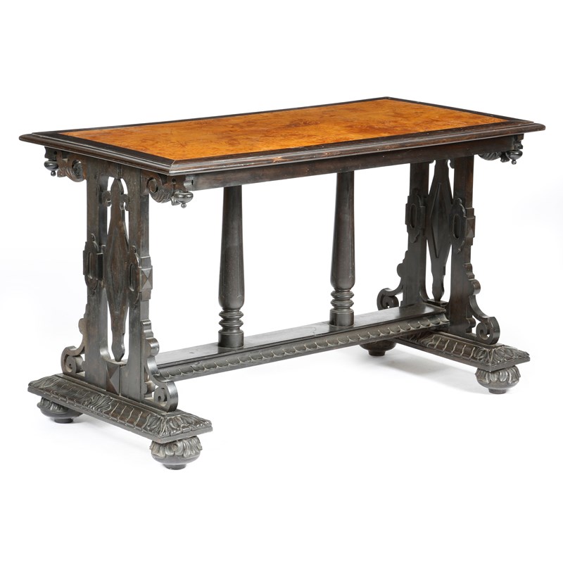 An early Victorian Anglo-Indian ebony library table to a design by Richard Bridgens, after a design by Richard Bridgens, the rectangular moulded edge top with a burr amboyna segmented panel, above pierced Gothic style trestle ends united by a central stretcher, with turned column supports, on leaf carved bun feet, 72.8cm high, 121.8cm wide, 61cm deep.