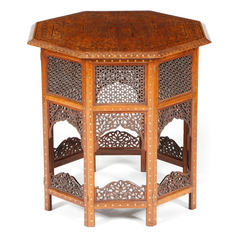 An Anglo-Indian hardwood octagonal occasional table, inlaid with copper, brass and ebony with a central star and floral borders, the detachable top on a folding base with carved and pierced panels, probably Lahore, early 20th century, 61cm high, 64.6cm wide.