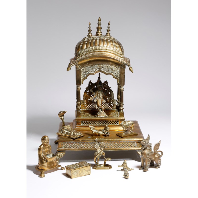 An Indian brass shrine, the canopy with three turned finials, with pierced decoration and peacocks, 46cm high, 31.8cm wide, together with a small collection of brass items, including Buddhist and Hindu figures, a model of a horse stamped 'RISING SUN J& CO JAIPUR', a box and other items. (11)