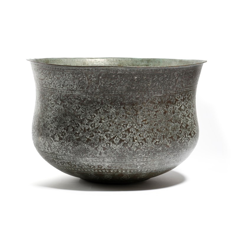 A Persian hammered copper bowl in Safavid style, the everted rim above a band of panelled inscriptions, on a lattice type leaf and flower ground, 19th century, 22.4cm high, 34cm diameter.