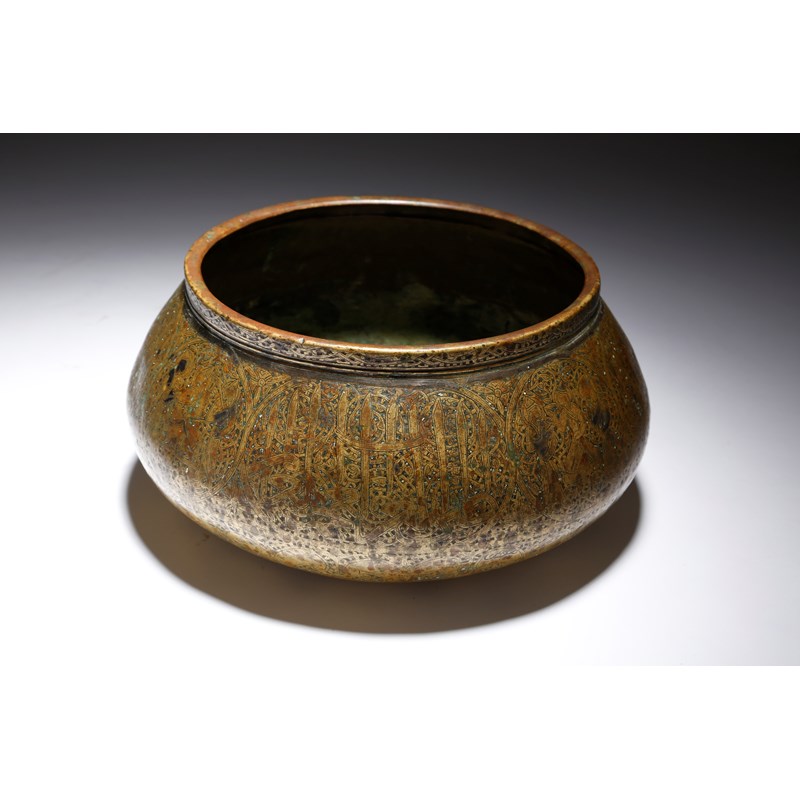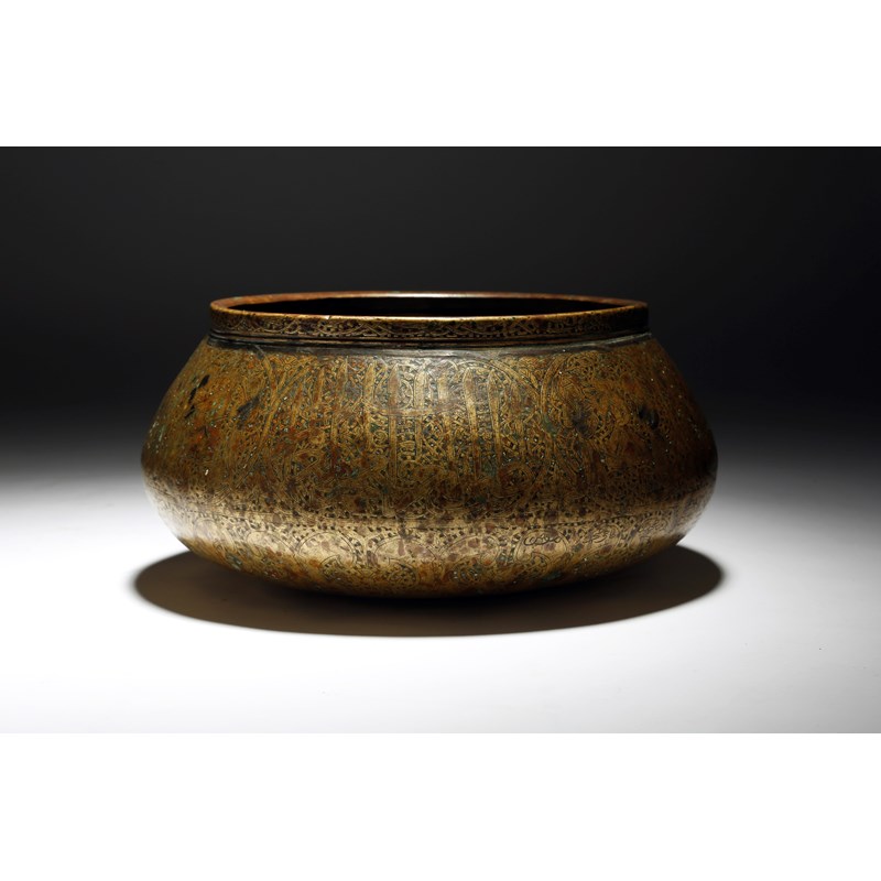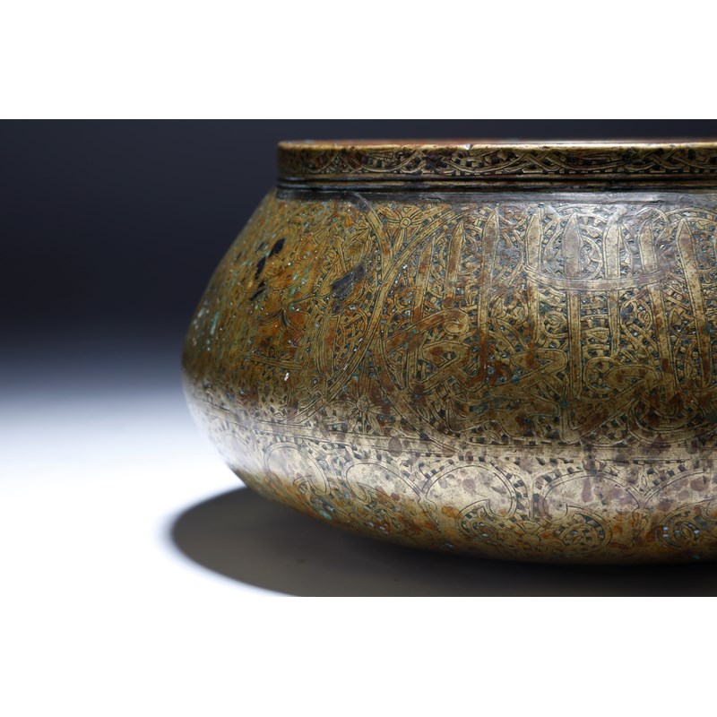 A 14th century Fars brass bowl, with interlaced decoration to the rim, the body engraved with oval cartouches with thuluth prayer inscriptions interspersed with rondels containing a seated ruler flanked by attendants, above bands of trefoil palmettes, with several inscriptions relating to previous owner's 'Owned by Ghiath Ad-Din Mohammad bin Hajji Mohammad Mo'men', then part scratched out and replaced with 'ya hafeez' and another 'Owned by Abu Mohsen', originally inlaid with gold and silver, traces of gold and black composition visible, West Iran, Ilkhanid period, 23.5cm diameter.