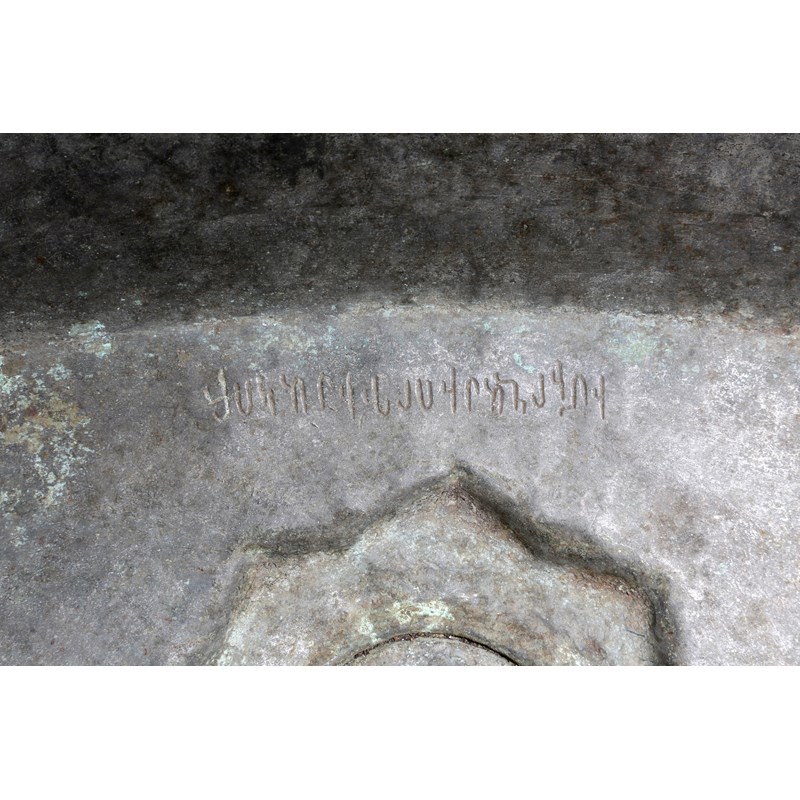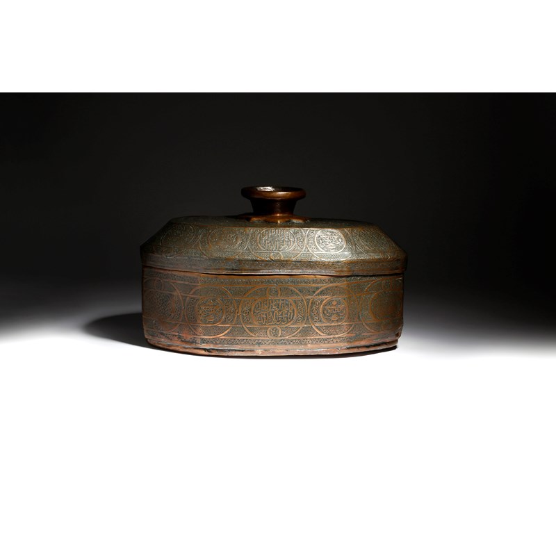 A Mamluk copper alloy canteen, of octagonal form, the lid with a dual purpose handle / foot, all over decorated with scrolling leaves, with rondels of calligraphy and hatched designs and palmettes, the underside of the lid with an Armenian inscription, Egypt or Syria, 15th century, 24.2cm high, 42.5cm wide.