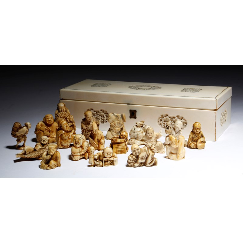 λ A collection of eighteen Japanese netsukes and carvings, ivory, marine ivory and bone, all of men in various pursuits, some holding fans, baskets and one with a fish, the seated figure with rats signed, the barrel carrier also with an inset red plaque signature, late 19th / early 20th century, contained in a late 19th century Chinese export ivory box. (19)