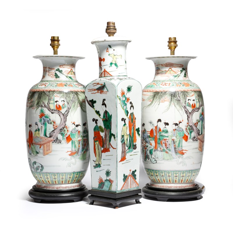 A pair of Chinese porcelain famille verte vases, converted into table lamps, painted with ladies in various pursuits, together with a Chinese famille verte square section vase, decorated with boys, bats and ladies, 54.1cm high. (3)