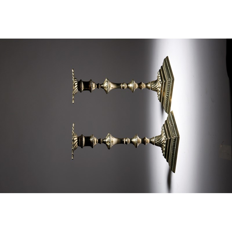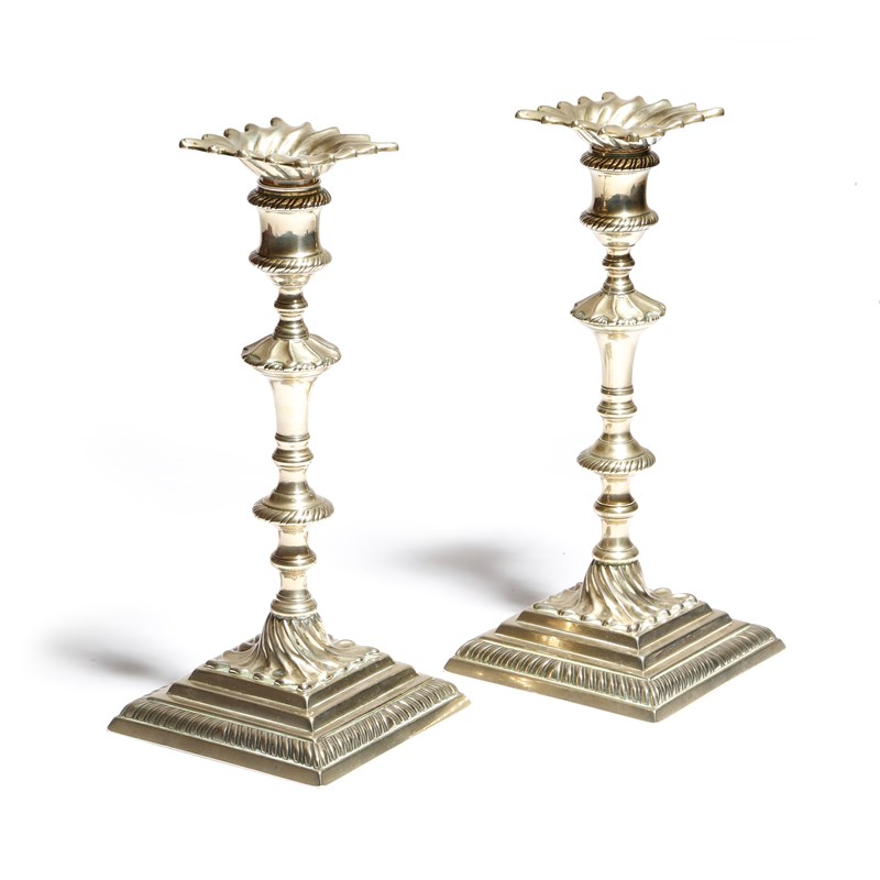 A pair of late 18th century paktong candlesticks, each with a fluted detachable drip-pan above a knopped stem, on a stepped square plinth foot, 26cm high. (2)