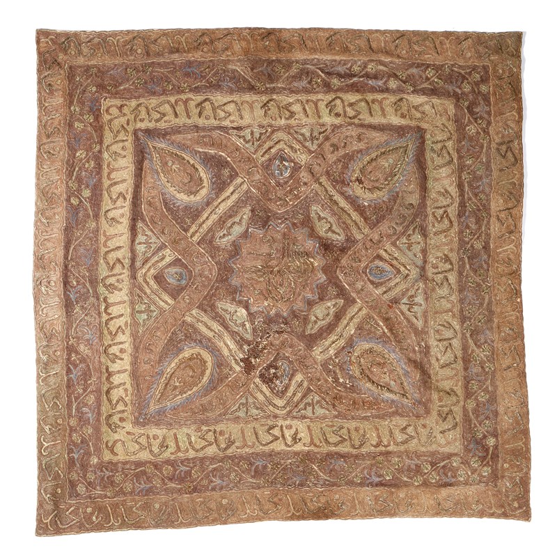 A 19th century Ottoman embroidered panel, worked with metal thread with leaf and script borders, the centre with boteh and a star motif, with a later backing, 101 x 99cm.