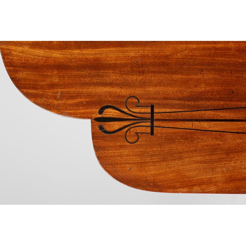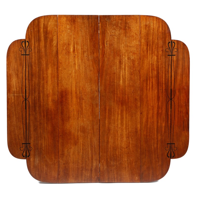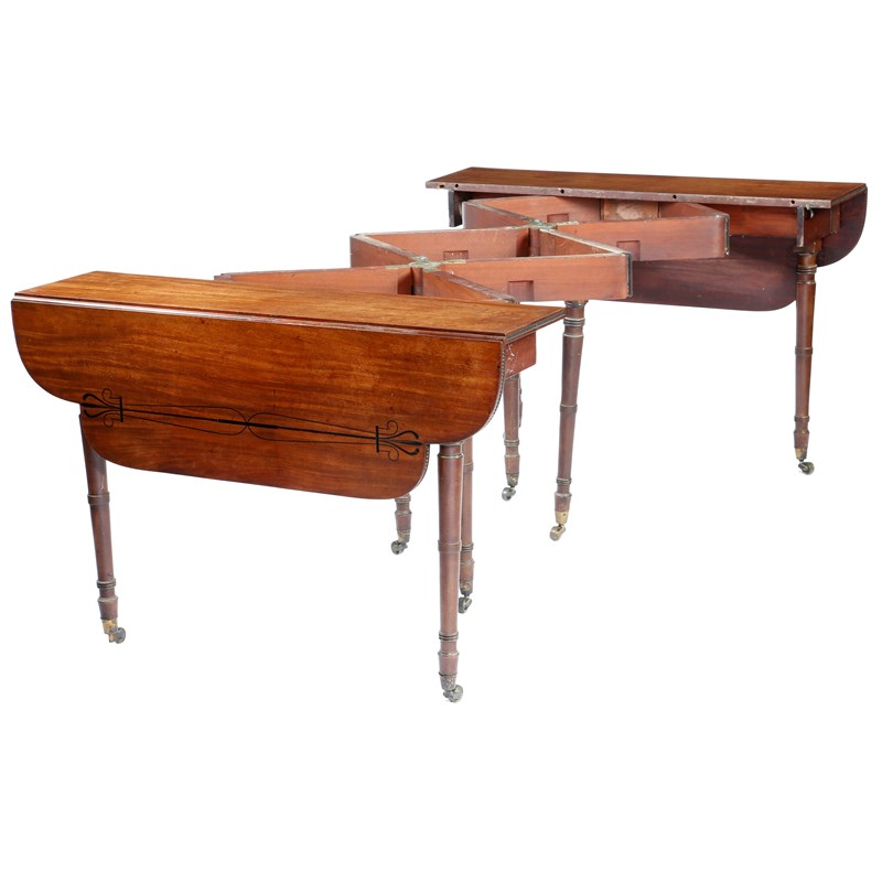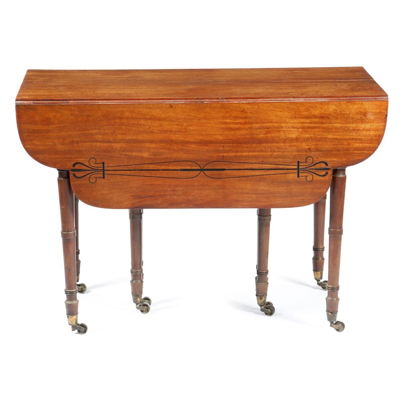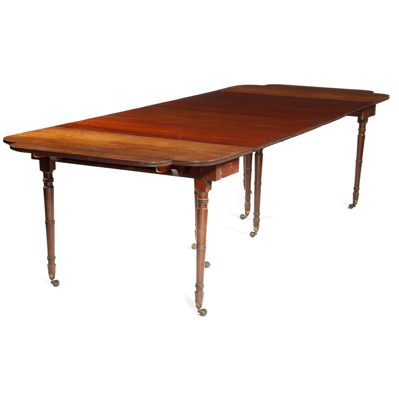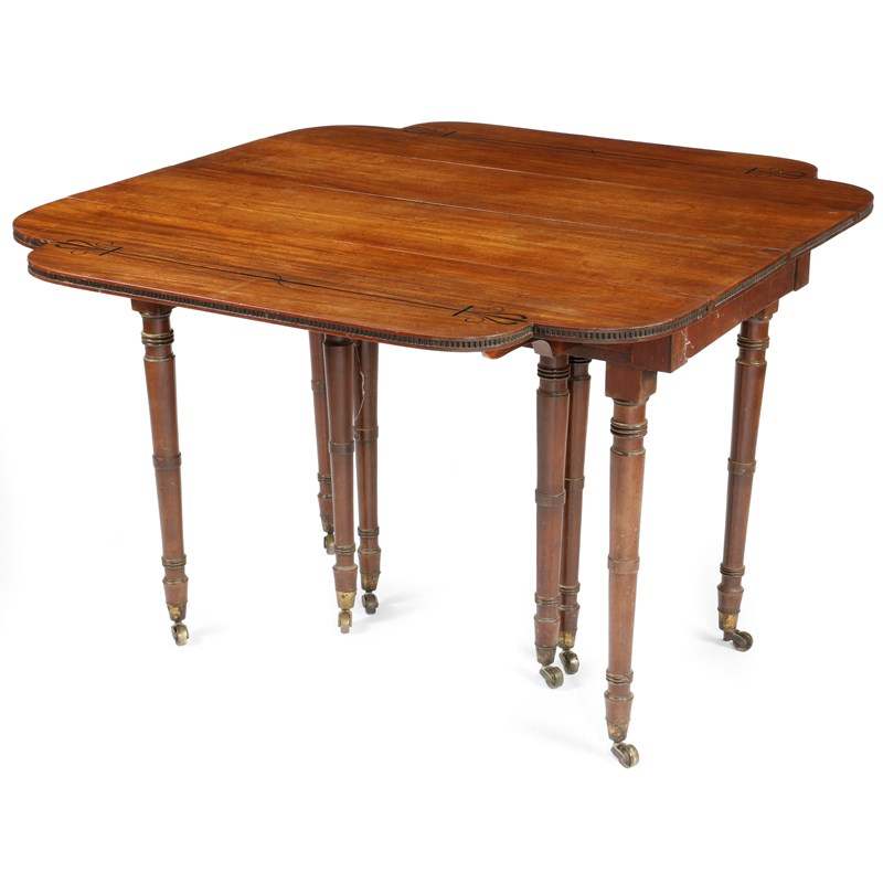 A Regency Scottish mahogany extending dining table, in the manner of William Trotter, the drop-leaf top with breakfront ends inlaid with ebony anthemion motifs, with a reel moulded edge, on a concertina Wilkinson type mechanism, accommodating four additional leaves, on ring turned and tapering legs and brass caps and castors, 72.5cm high, 296cm long, 106cm deep.