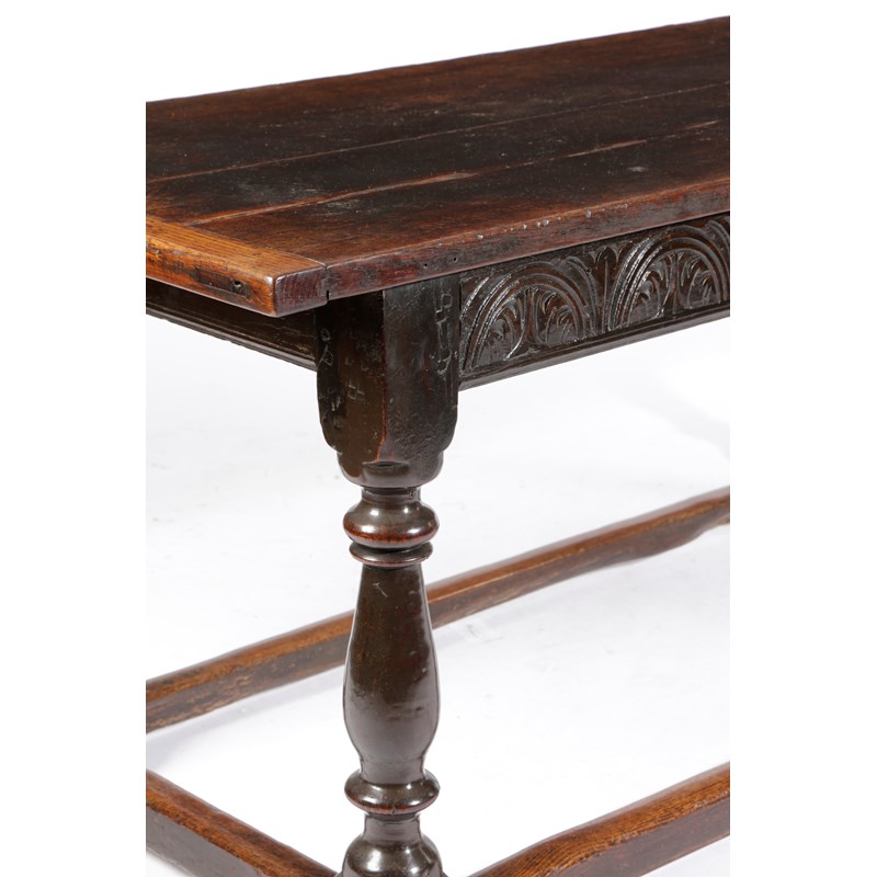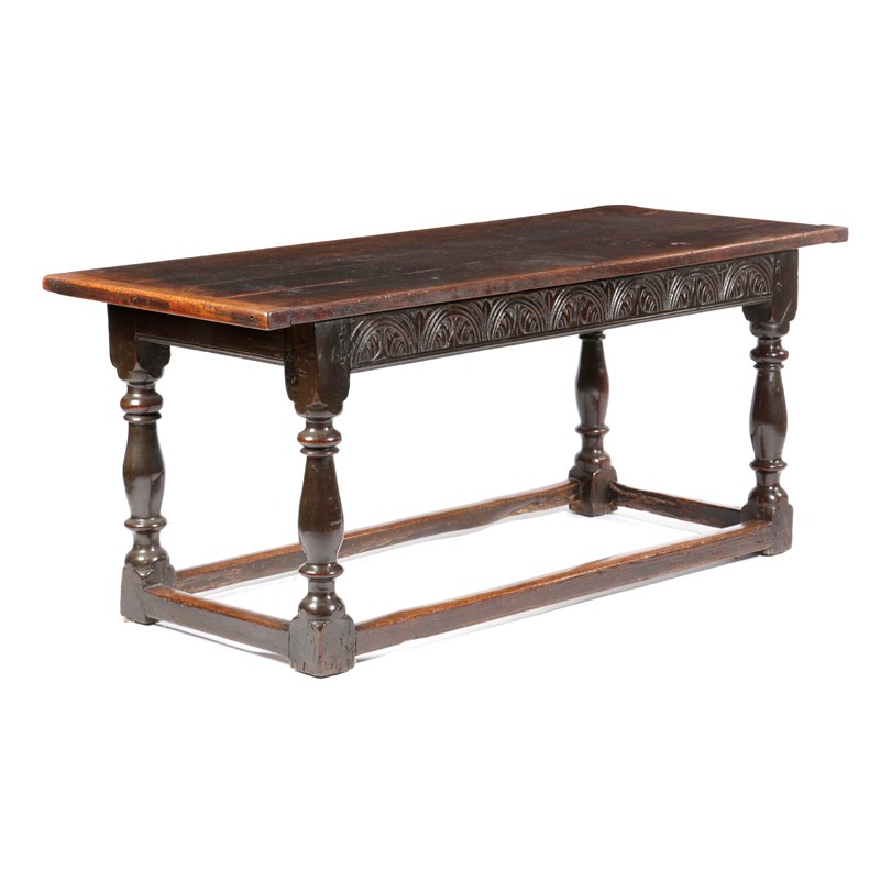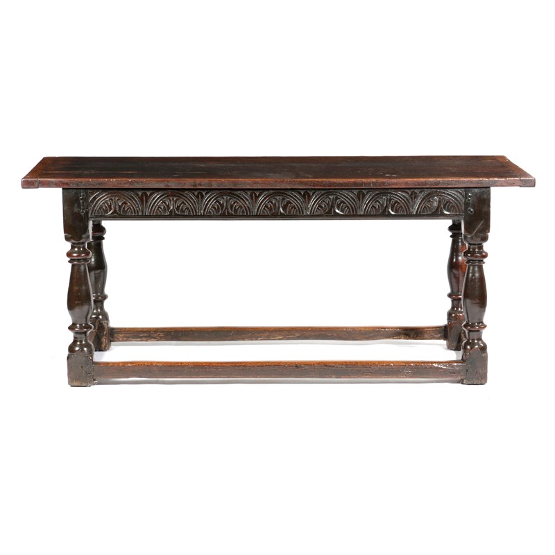 the twin plank top with cleated ends above a leaf carved lunette front frieze on baluster turned legs united by peripheral stretchers