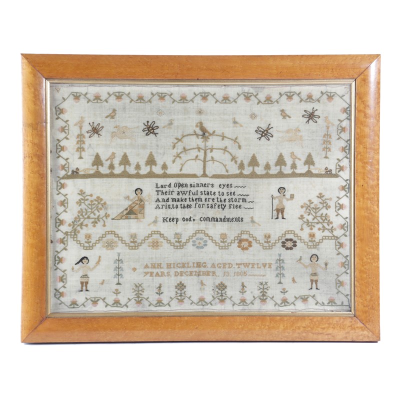 worked in colours with a parrot in a tree amongst insects and other birds including a pair of phoenix, above a prayer flanked by a pair of figures and the inscription 'Ann. Hickling. Aged. Twelve Years. December. 13. 1805' flanked by a pair of falconers, inside a meandering border of strawberries, in a glazed Bird's eye maple frame