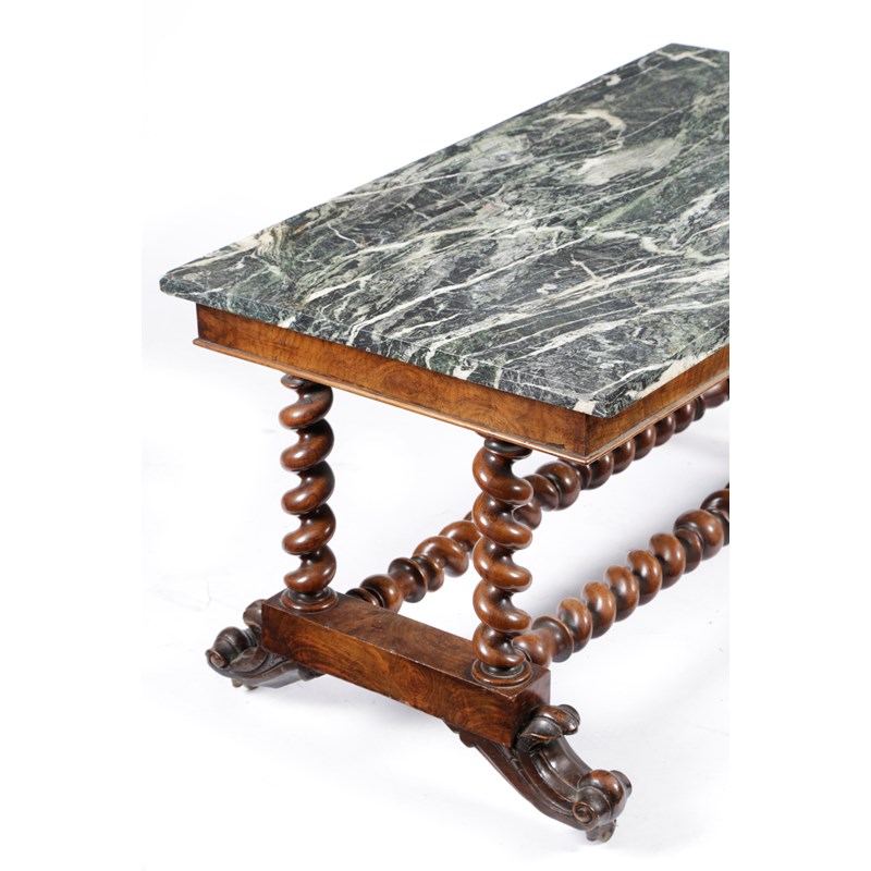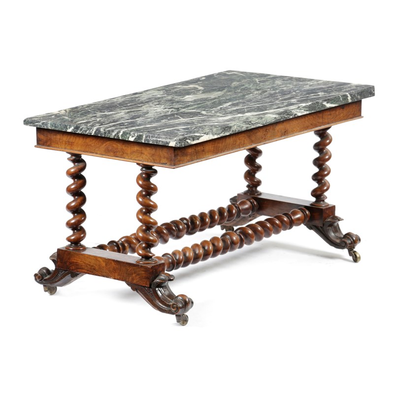 A WALNUT AND GREEN MARBLE COFFEE TABLE