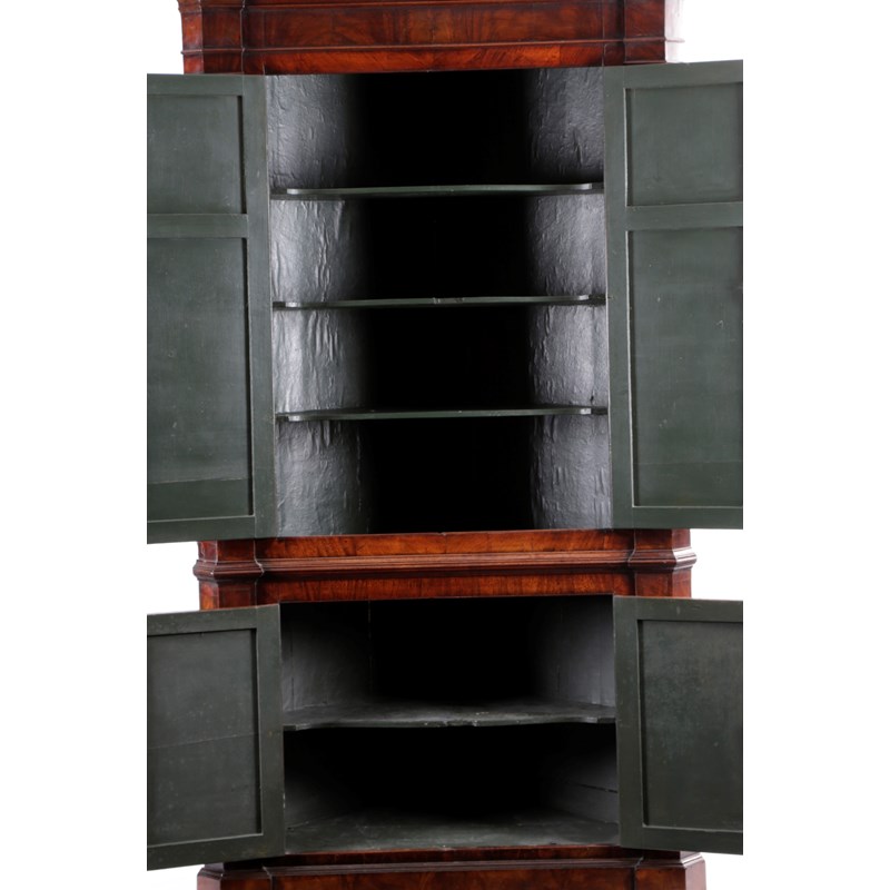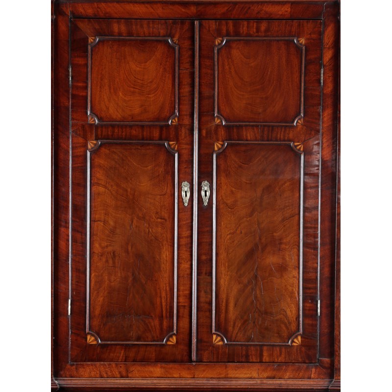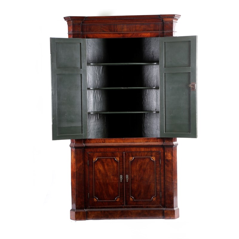 inlaid with stringing, the inverted breakfront dentil cornice above a pair of panelled doors with outline mouldings and parquetry fan spandrels enclosing a later green painted interior with three shelves, the conforming base with a single shelf
