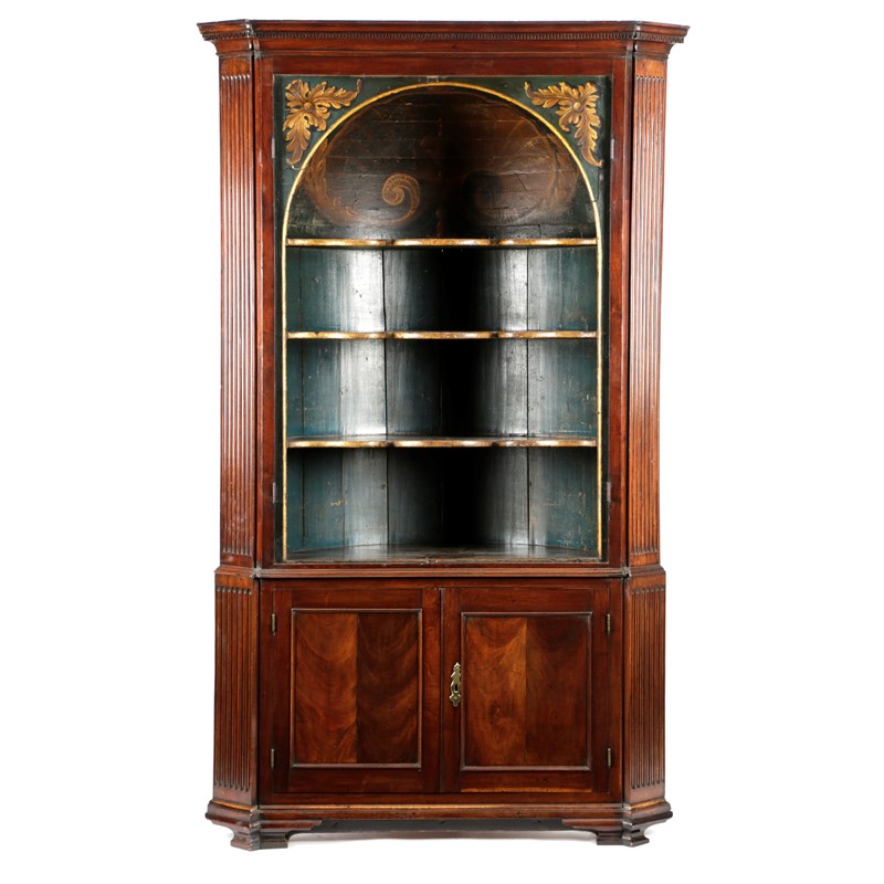 AN EARLY GEORGE III MAHOGANY STANDING CORNER CABINET