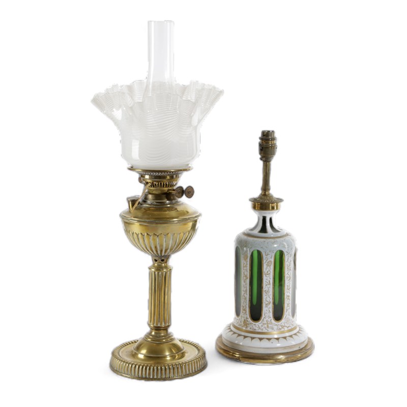 white cut through to green with gilt floral decoration, together with an Edwardian brass oil lamp with a Duplex burner, chimney and white striated glass shade, both fitted for electricity (2)