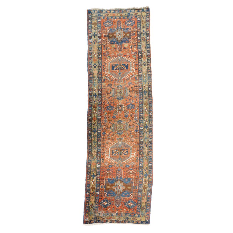 the terracotta field with a column of latch hook and cruciform medallions surrounded by stylised plants and flowerheads enclosed by pale lemon borders of angular vines and similar indigo guard stripes