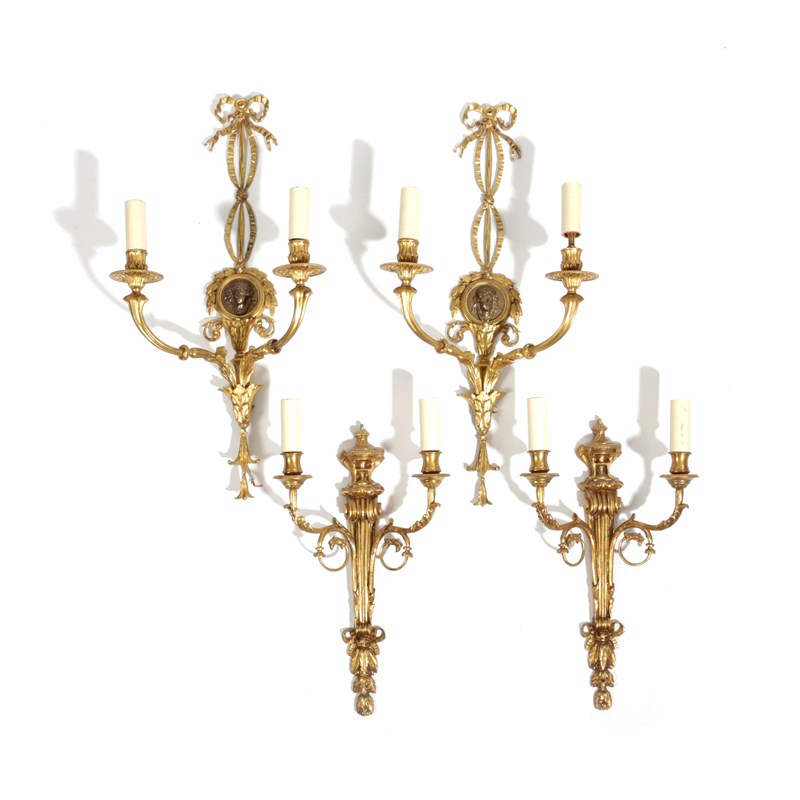 each with a central patinated rondel with a female bust beneath ribbon bows, supporting a pair of branches, together with another pair each with an urn above a tapering body supporting a pair of scrolling branches, fitted for electricity (4)