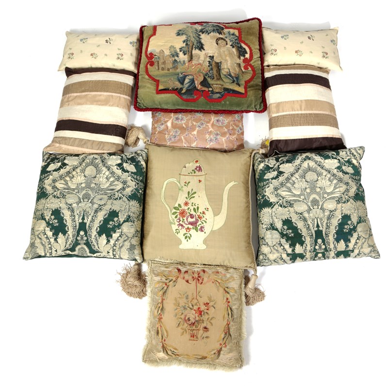 depicting a young couple in a country setting, mounted as a cushion, together with a silk cushion embroidered with an 18th century creamware coffee pot and cover, another mounted with an Aubusson style needlework floral panel and other cushions (10)
