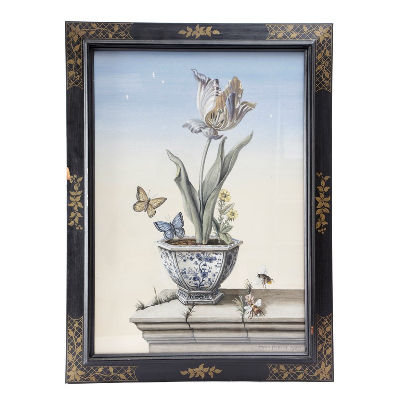 of an auricula and a parrot tulip, each with insects and on a stone shelf, in chinoiserie ebonised and gilt frames (2)