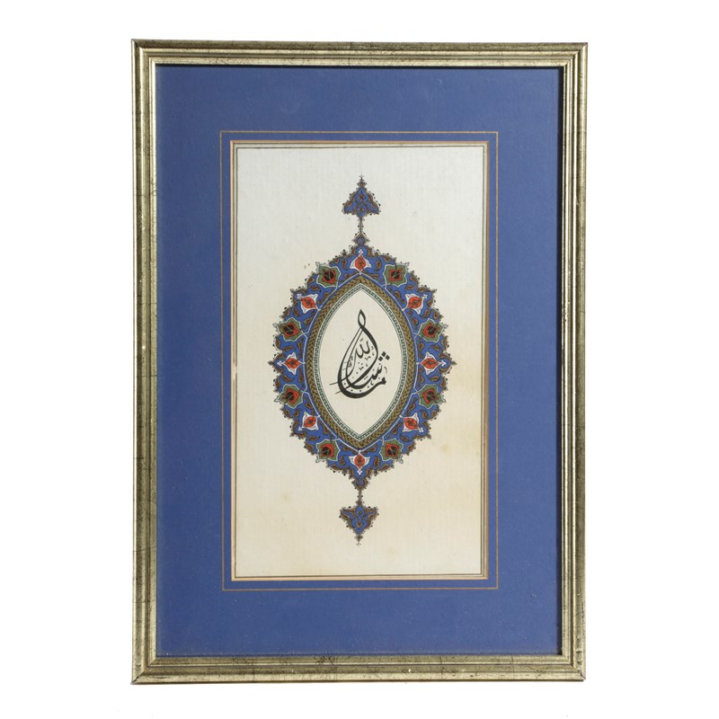 the oval design with a central Arabic character inside a painted and gilded foliate border, framed