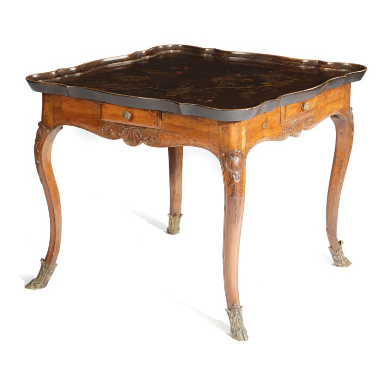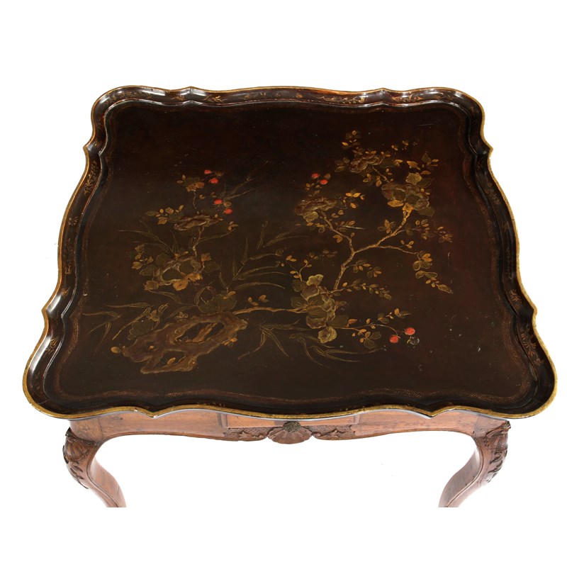 A FRENCH WALNUT, BEECH AND JAPANNED TRAY-TOP TABLE