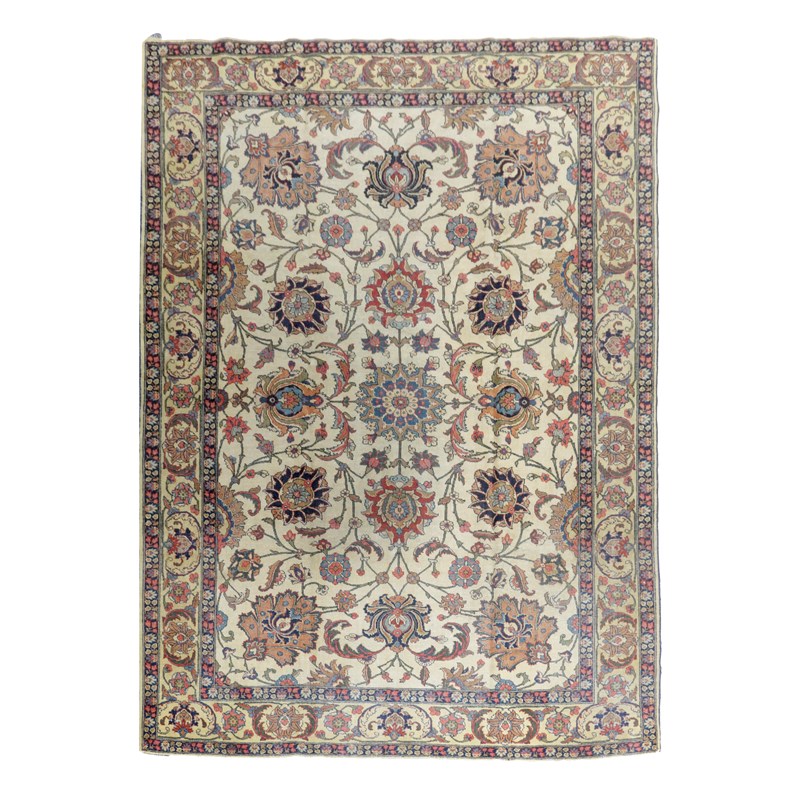 the cream field centred by a flowerhead medallion surrounded by palmettes and further large flowerheads linked by vines framed by lemon borders of meandering vines flanked by indigo guard stripes