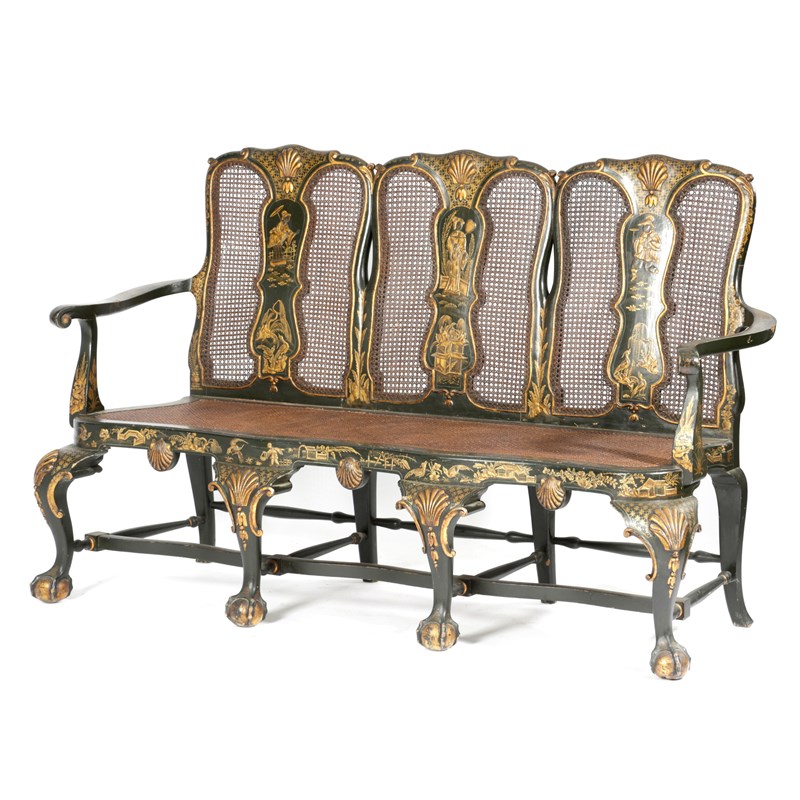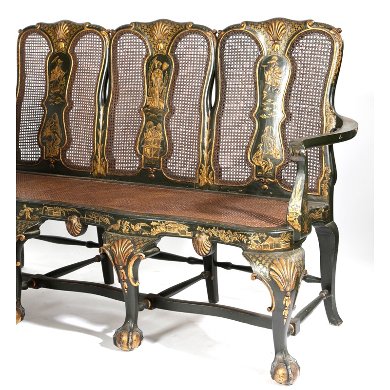 with gilt chinoiserie decoration with figures, flowers and latticework, with a cane back and seat on shell capped cabriole legs and claw and ball feet, comprising: a three seater settee and a pair of armchairs (3)