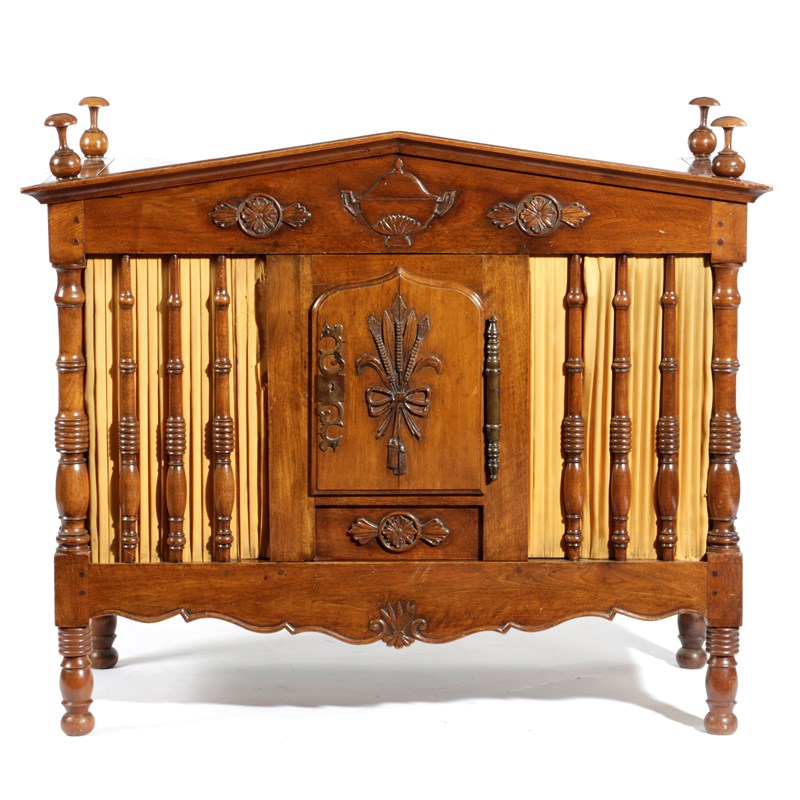 with a hinged top, the classical pediment above a frieze carved with an urn and floral rondels, the hinged door decorated with sheaves of wheat enclosing a later lined interior, the exterior with turned spindles backed with pleated silk