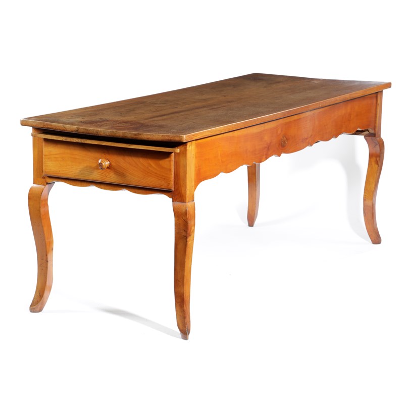 A FRENCH CHERRYWOOD FARMHOUSE KITCHEN TABLE