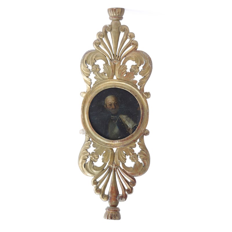 carved with anthemions, tassels and scrolling foliage around a circular oil on copper portrait of a naval officer