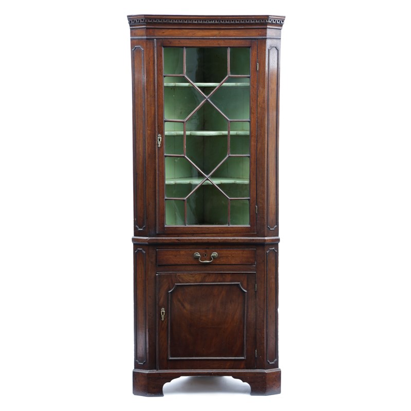 A GEORGE III MAHOGANY STANDING CORNER CUPBOARD...