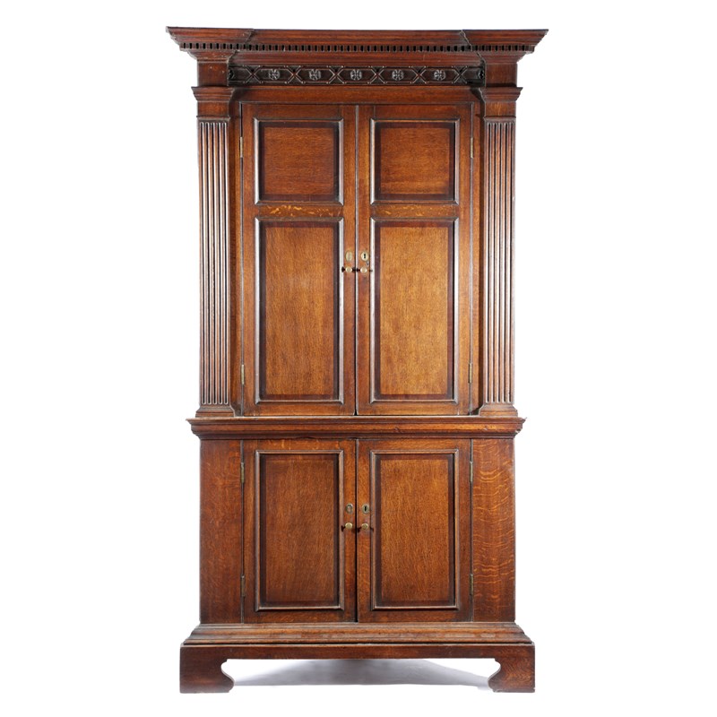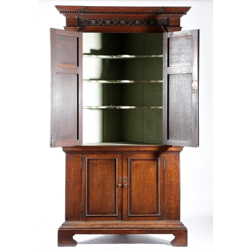 A GEORGE III OAK STANDING CORNER CUPBOARD NORTH...