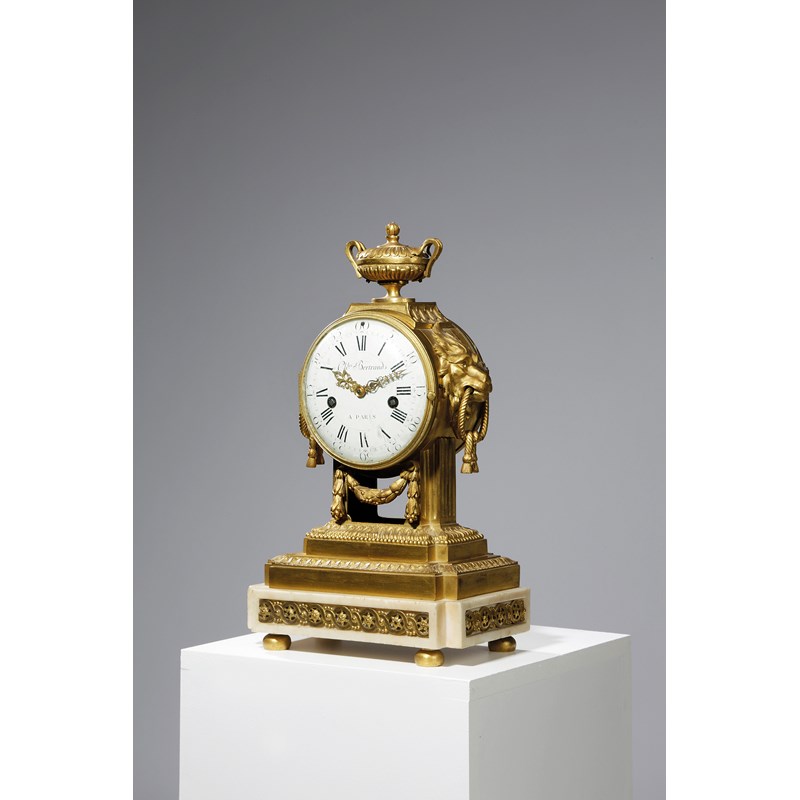 the brass eight day movement inscribed 'Chles Bertrand Paris', with an external countwheel striking on a bell, the domed, white enamel dial with black Roman hour and white Arabic five minute numerals inscribed 'Chles Bertrand/A PARIS', with pierced gilt metal hands, the cylindrical case surmounted by a fluted urn, flanked by a pair of lion heads holding knotted rope swing handles and above a fruiting laurel swag, on a shaped rectangular stepped base with bands of cast foliate and flowerhead decoration on bun type feet, with key
