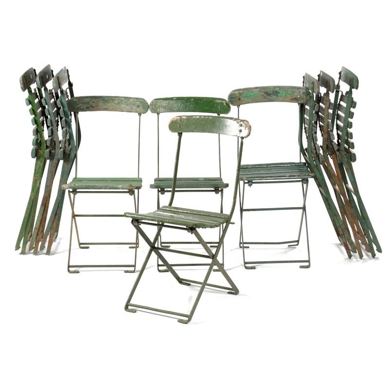 A SET OF TEN GREEN PAINTED METAL FOLDING GARDEN...