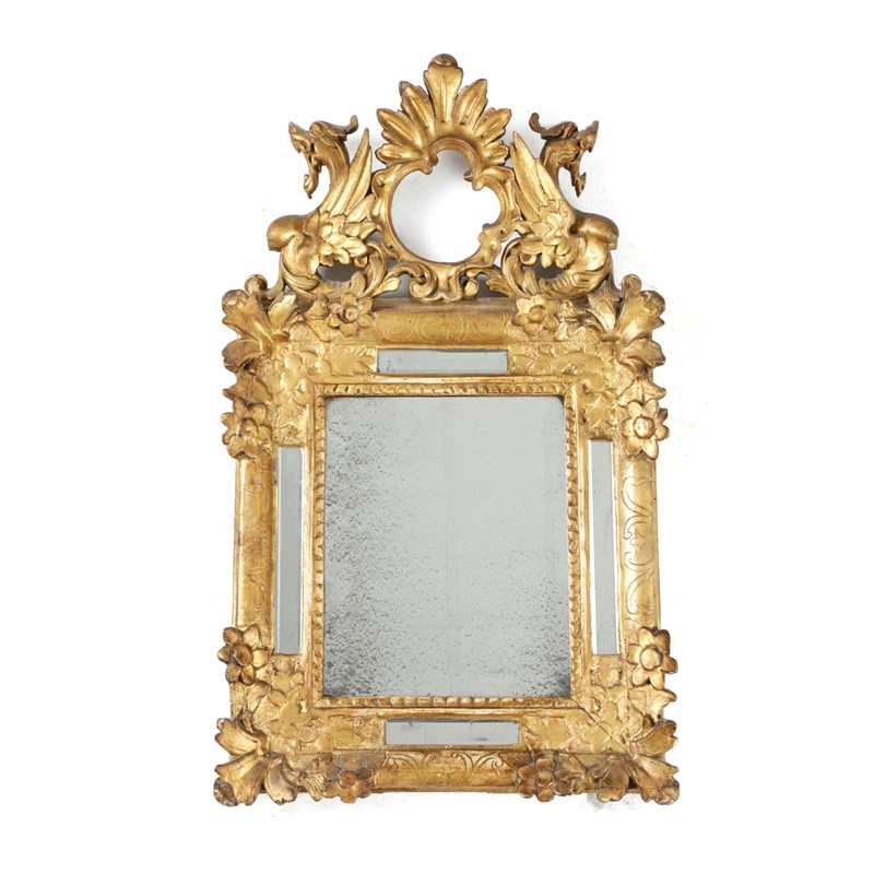the rectangular bevelled plate inside a mirror and floral frame and beneath a Rococo cartouche flanked by winged beasts