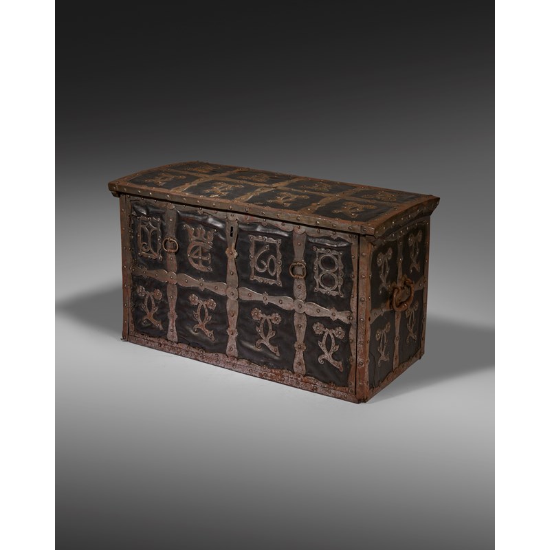 A RARE DANISH CHRISTIAN IV ROYAL BALTIC OAK LEATHER AND IRON BOUND CHEST