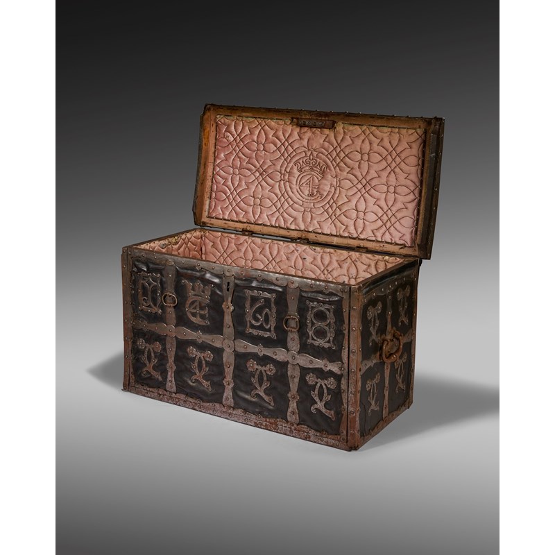 the slightly domed hinged cover externally divided into squares containing cut and engraved iron double 'James I' Royal roses above a front with a pair of iron handles and divided into rectangular panels, the top row enclosing the date '1608' flanking the Royal Cypher, the lower row with the Royal rose motifs, the sides similarly decorated with the Royal rose motifs and cast iron swing carrying handles, the back also similarly decorated, the top hinged to reveal a deep compartment with pink silk quilted lining worked with silvered thread with the Royal Cypher surrounded by flowerhead and strapwork motifs