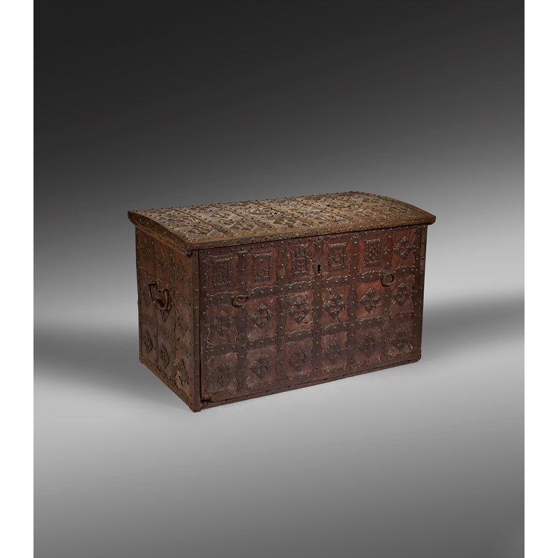 A RARE DANISH CHRISTIAN IV ROYAL BALTIC OAK LEATHER AND IRON BOUND CHEST