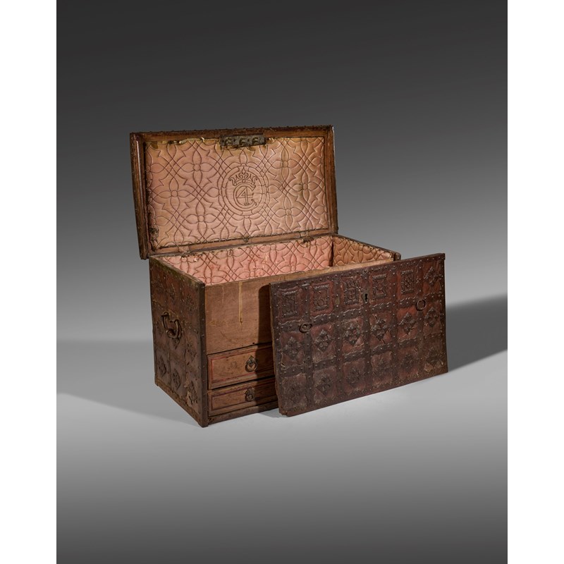 Both this and the following lot were included in an exhibition titled 'Christian IV and Europe - The 19th Council of Eurpoe Exhibition, Denmark 1988, numbers 394 and 395 with one chest being illustrated in the Exhibition Catalogue. Both chests were listed as being loaned from an English Collection with one being bought from Christies in 1974 and the other from a London dealer. There was, however, some uncertainty as to which chest came from Christes and the other from a dealer.