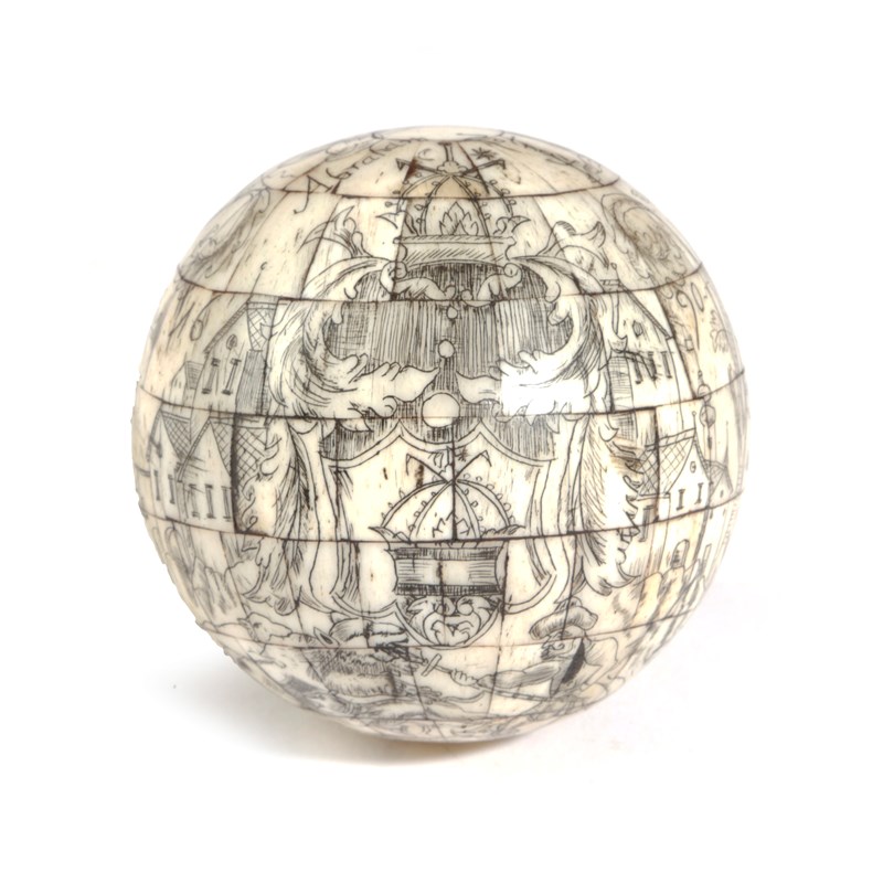 A BONE SCRIMSHAW GLOBE decorated with a...