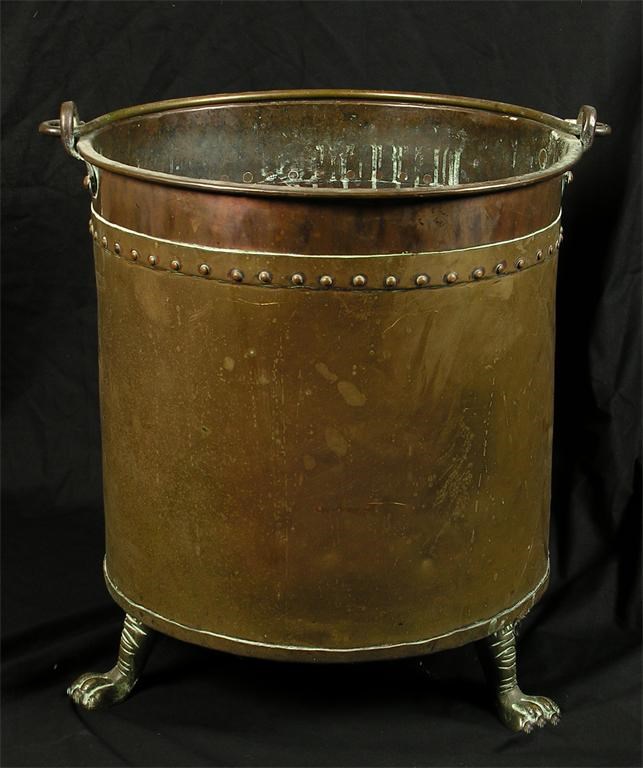 A copper and brass banded cylindrical log bin, on paw feet to a swing handle, 19.5in (49.5cm) h, 16.25in (41.2cm) dia.
