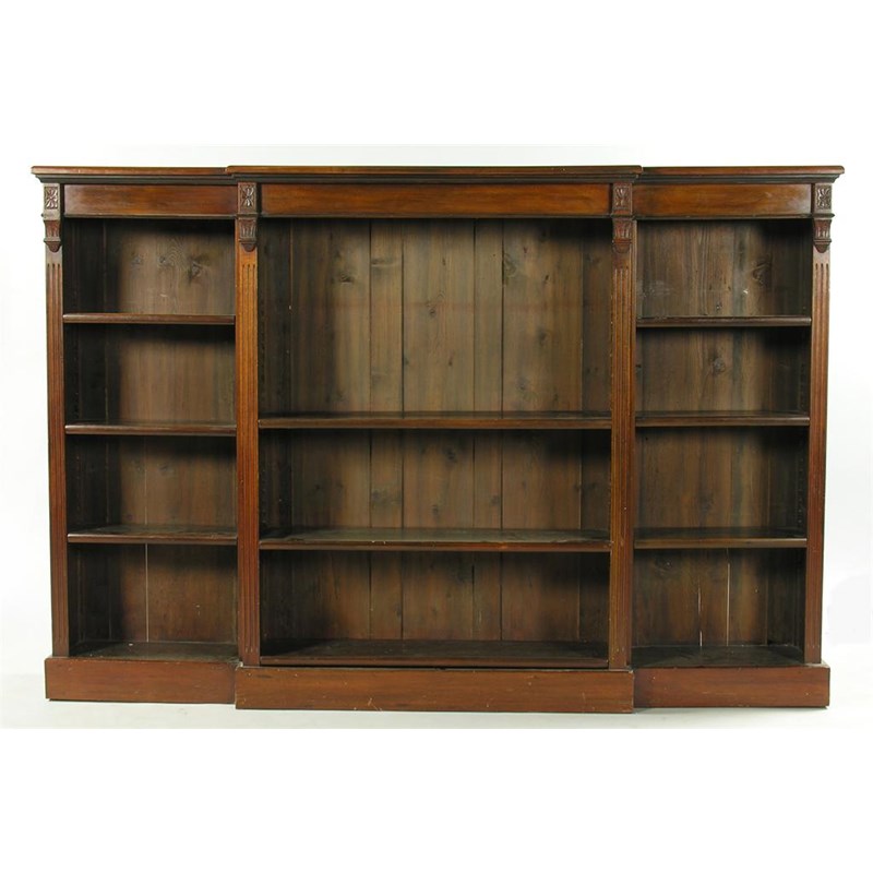 An Edwardian mahogany breakfront open bookcase, with adjustable shelves, 48.5in (123.2cm) h, 72in (183cm) w, 13in (33cm) d.