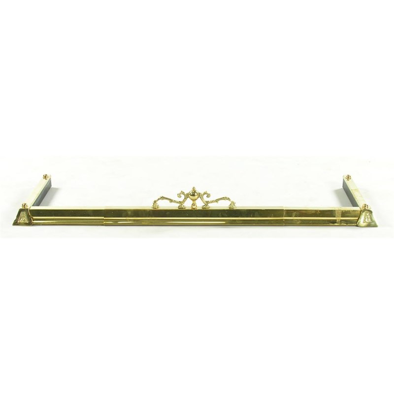 A brass adjustable fender, with a scroll and globe surmount, 5.5in (14cm) h, 52in (132cm) w, closed, 16in (40.6cm) d.