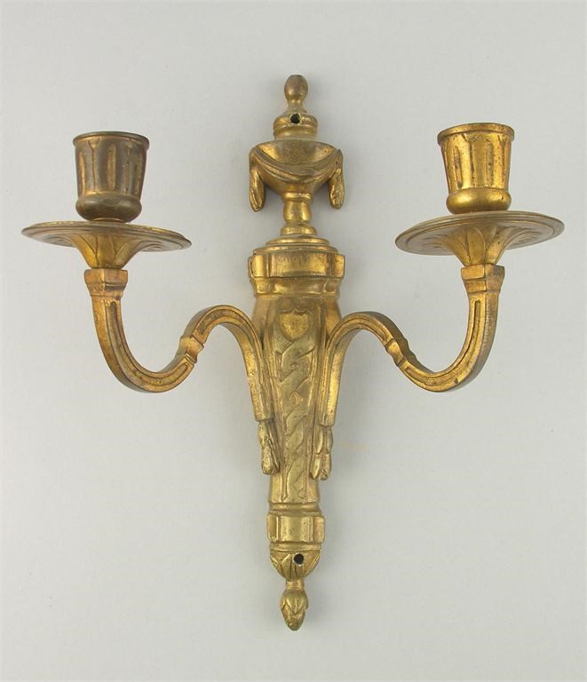 A pair of late 19th Century gilt brass twin branch wall lights, 10in (25.4cm h, 8.25in (21cm) w, 4.25in (10.8cm) d (2)