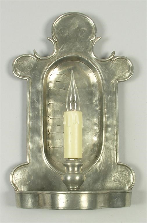 A set of six pewter wall sconces, in 17th century style, with electric fittings, 13in (33cm) h, 8in (20.4cm) w, 4in (10cm) d. (6)