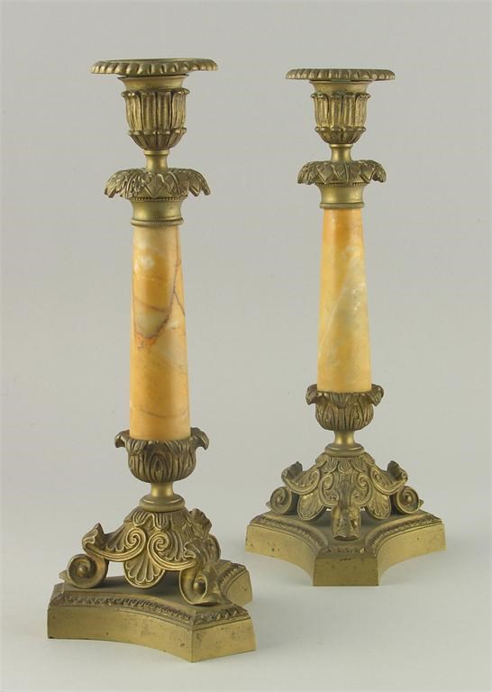 A pair of French brass and onyx candlesticks, 11.5in (29cm) h. (2)