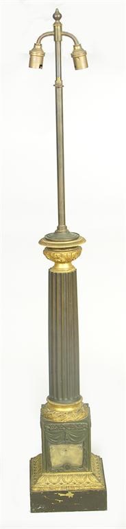 A gilt brass and patinated table lamp, the glazed panel base containing a single barrel movement, the adjustable top stem with a twin light fitting, 35.5in (90cm) h.