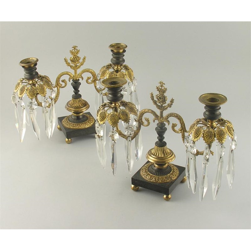 A pair of early 19th century bronze and gilt brass twin branch candelabra, hung with cut glass lustres, with differing detachable sconces, 9.25in (23.5cm) h, 11.5in (29.2cm) w. (2)