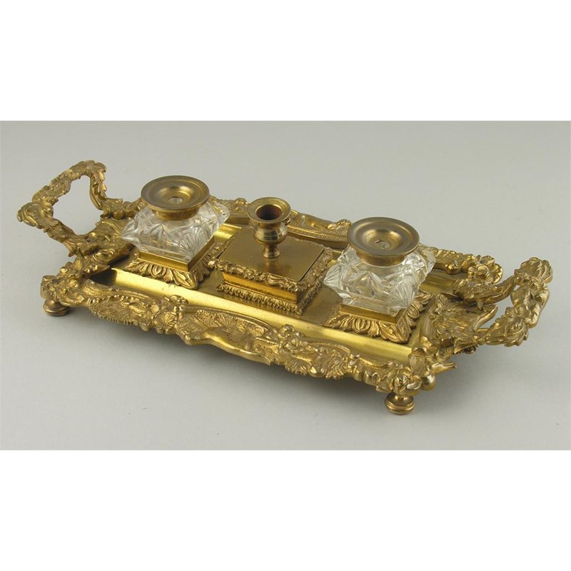 A late 19th century ormolu desk stand, the cast border decorated hounds, hares and foxes, 14in (35.5cm) across handles.